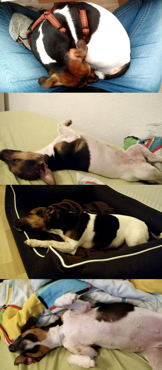 kenn ich nur zu gut, meine JRT Hündin, schläft auch am liebsten auf dem Schoss, der größte Genuss für sie ist jedoch mit unter den Teppich auf dem Sofa liegen zu dürfen... :)