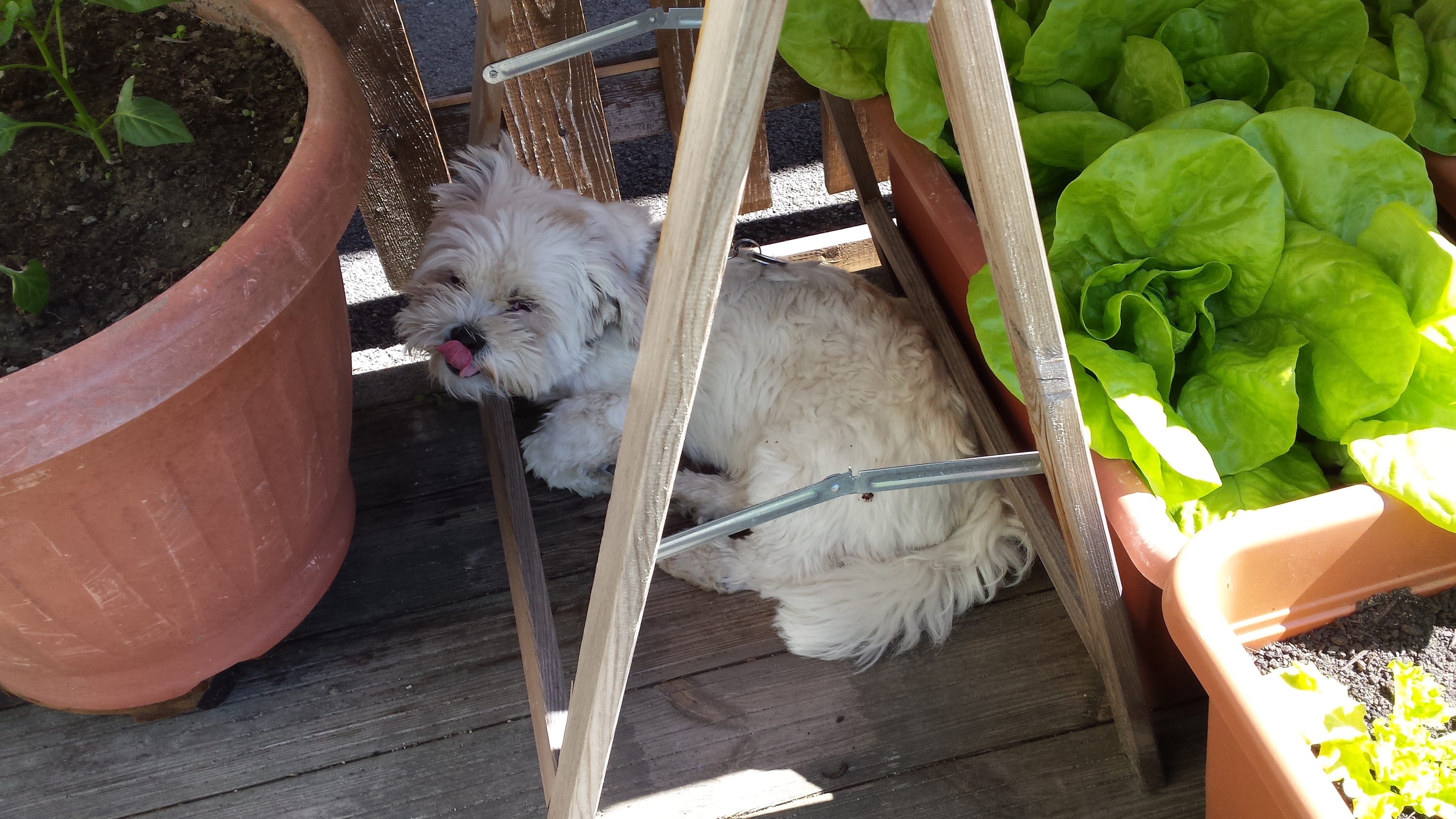 Schöner schattiger Platz! Erstaunlich ist für mich, dass Charly kein Interesse am Salat hat...