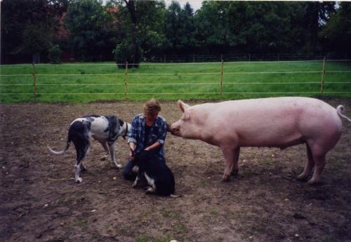 Dogge Cara, Wollschwein Susi als Ferkel und Edelschwein Freddy, alle bereits auf der RBB - nur ein Testbild zur Funktionsprüfung