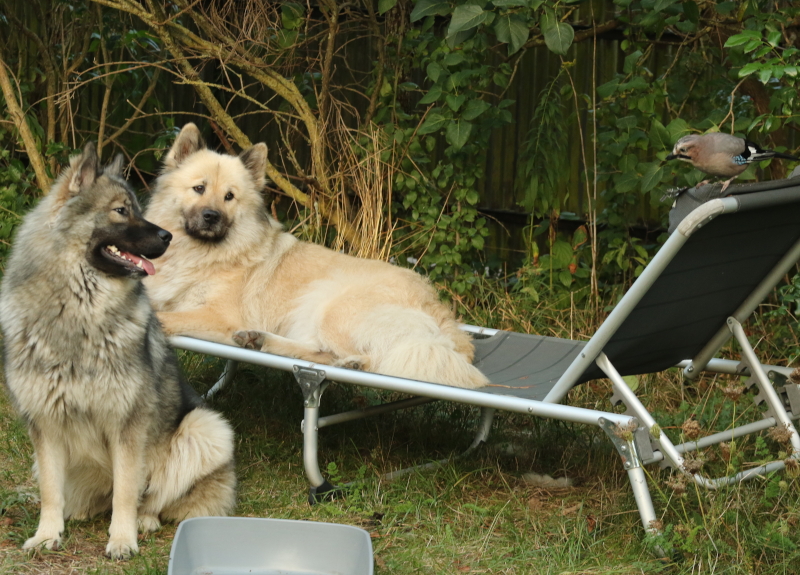 Anfang Juli haben wir auf einem Spaziergang einen aus dem Nest gefallenen Eichelhäher gefunden. Vor fast zwei Monaten haben wir ihn "freigelassen". Er ist allerdings der Meinung, dass man bei uns gut wohnen kann. Ins Haus und in den Wintergarten darf er nicht mehr, aber im Garten leistet er uns immer wieder Gesellschaft. Er kann sich selber verpflegen, bekommt an einer Futterstelle aber weiterhin Nüsse, Beeren und Ähnliches.