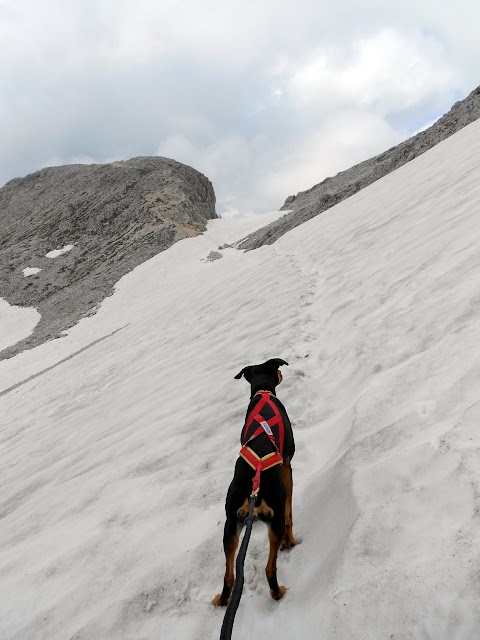 Vajolonpass im Rosengarten. Direkt vor dem Pass ist eine Leiter, und wie die Hüttenwirte auf die Idee kommen, da käme man mit Hund leicht dran vorbei verstehe ich nicht... Angeblich können Hunde die Stelle überwinden, wenn es die Leiter runter geht, hoch zu war es -zumindest für mich allein mit Hund- nicht ohne Risiko für Cati zu bewältigen.