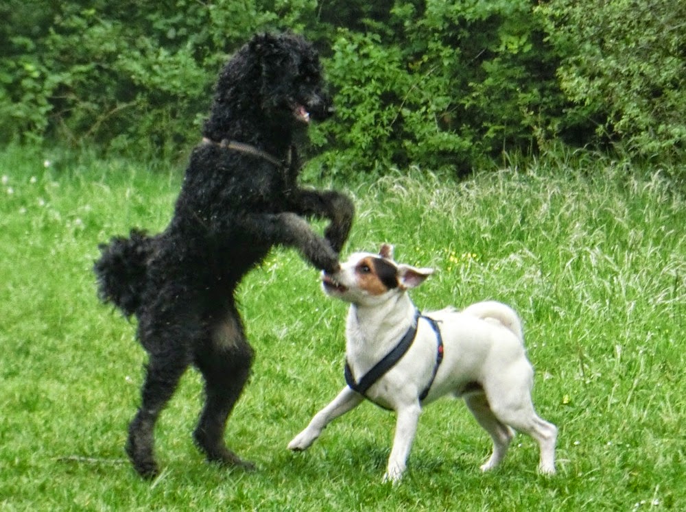 Als Cala noch fit war, war sie ne Dampfwalze, wenn sie sich mal dazu herabgelassen hat zu spielePudelspiel, selbst wenn es ungestüm ist, ist ganz anders, weil die so "bouncy" sind. Da geht die Energie eher nach oben als dampframme-artig nach vorne. Meiner setzt zwar den Körper ein, aber nicht seine Masse/Gewicht, um den anderen umzubolzen. Er würde auch NIE volle Pulle wogegen rennen, wie ich das bei Labbis schon erlebt habe.