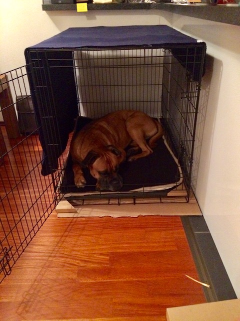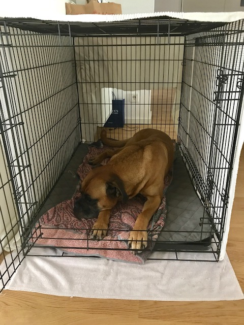 er kennt seinen kennel/käfig. er liebt seinen kennel/käfig und zuhause haben wir ihn jetzt zum üben bis zu drei stunden im geschlossenen kennel allein zuhause gelassen.
