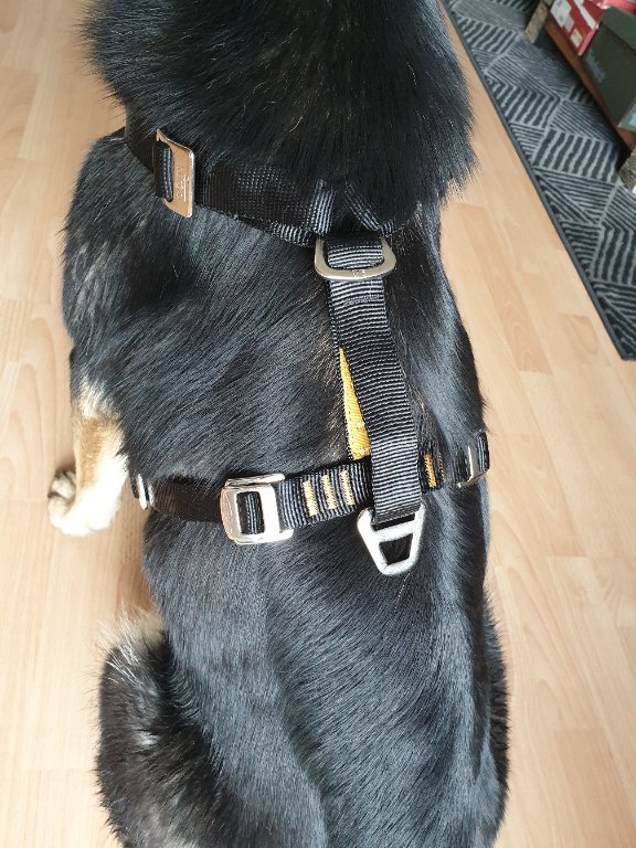 Für die anstehenden Urlaubsfahrten, in denen ich den Kofferraum und 1/3 umgeklappte Rückbank brauche, hab ich für Ella jetzt das Kurgo Enhanced Strenth Tru-Fit Geschirr gekauft.