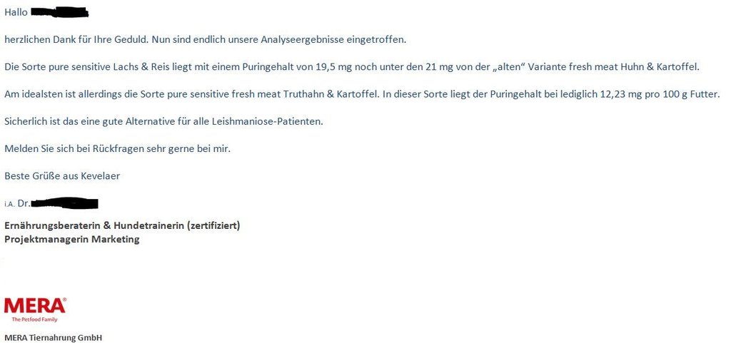 Nur Mera Dog liegt da deutlich drunter. So deutlich, dass ich nicht weiß ob ich das glauben kann. Zumal ich schon von einem Hund las, der nachweislich unter diesem Mera Dog Xanthinkristalle entwickelt hat, womit dann der angeblich so extrem niedrige Gehalt von Purin anzuzweifeln wäre.