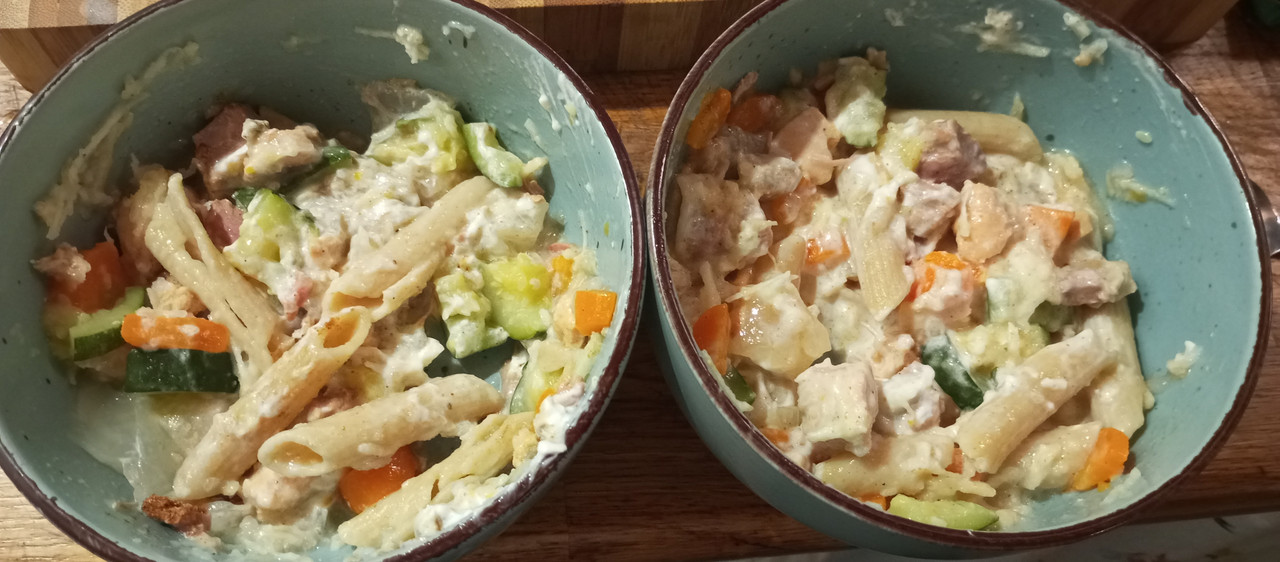 Heute gab es Vollkornnudeln, Hühnchen Filet, Zucchini, Möhren, geriebener Apfel, Quark, Algenöl,Hagebuttenpulver und für Ömchen Pulver für die Leber.
