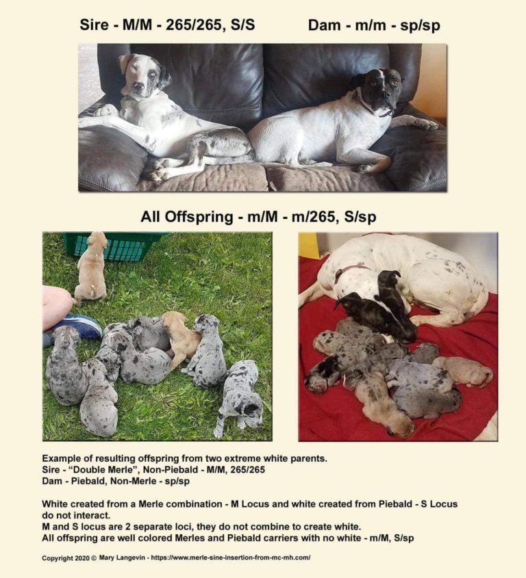 Andersrum kannst du zwei M/m x M/m Hunde verpaaren und hast ein Risiko, dass M/M Hunde fallen, wo definitiv Pigment zu weiß reduziert werden kann.