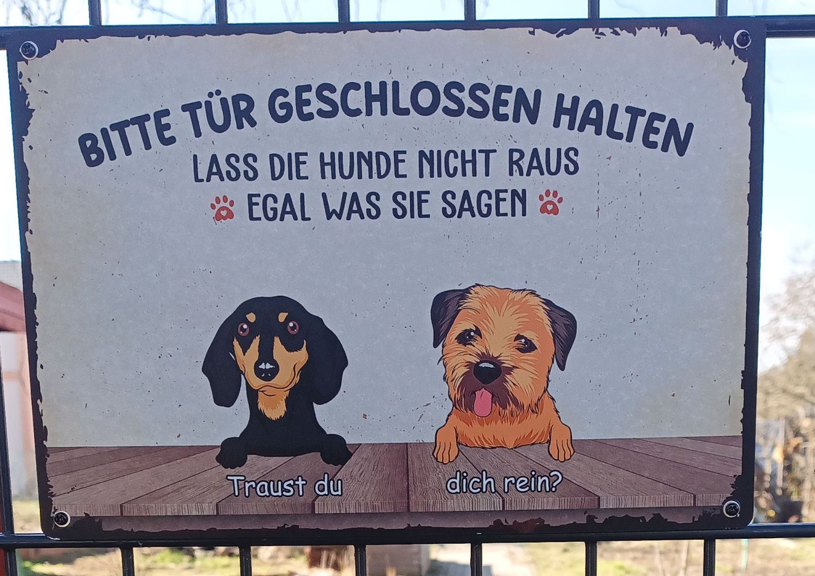 Wir haben uns ein Türschild gegönnt. Dackel und Border Terrier geben ganz gute Karikaturen für unsere beiden ab (deren Rassen konnte man nicht auswählen).