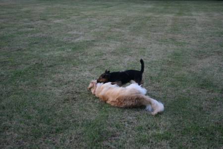 Wenn ein 11 Wochen alter Welpe und 3 jähriger Bernhardiner Mix spielen, sind das ja doch sehr ungleiche Gefährten. Der Kleine kullert durch die Gegend, es macht ihm ja schon Spaß. Jo-Jo läßt sich auch hinfallen und rollt durch die Gegend, nur meist kommt er mit dem Nacken und den Schultern auf. In der Wiese mache ich mir weniger Gedanken, aber der Bodenbelag interessiert ihn nicht, er macht das auch auf dem Pflaster hinter dem Haus. Auch überrennt Benni den Zwerg schon mal.