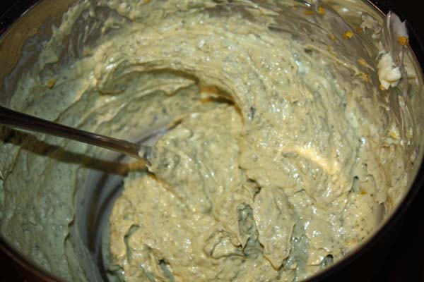 Eine Farce aus 1 Stück Butter, 1 Bund Oregano, Majoran und Rosmarin herstellen. Die weiche Butter mit den grob gehackten Kräutern und 2 Knoblauchzehen pürieren. Salzen und mit etwas getrocknete Chilischote würzen. Von einer halben Zitrone Zesten abraspeln und fein hacken. Untermischen.