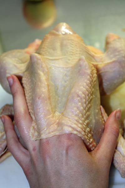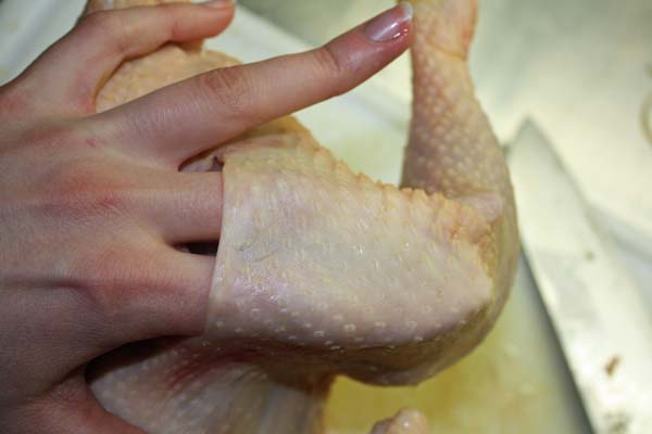 Einen kleinen Schnitte am Schenkel durchführen und die Haut vorsichtig vom Fleisch lösen.