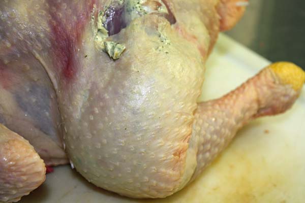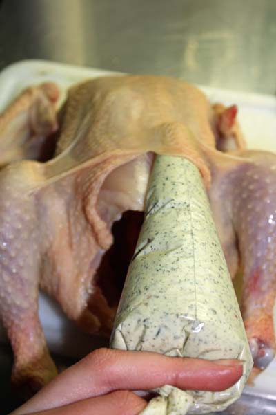 Die Butterfarce in einen Spritzbeutel füllen und unter die Haut spritzen.