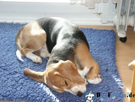 Er sitzt nicht wie andere Hunde auf dem boden sondern macht die Hinterbeine unterm Körper lang und lehnt sich an irgendeine Wand.