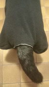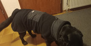 Im Besitz sind für Herrn Hund zwei Bademäntel, ein Regenmantel und ein zu kleiner Back on Track Fleecemantel, weil er als Labrador Retriever bisher keinen Wintermantel brauchte und eigentlich auch gut schützende Unterwolle hat.