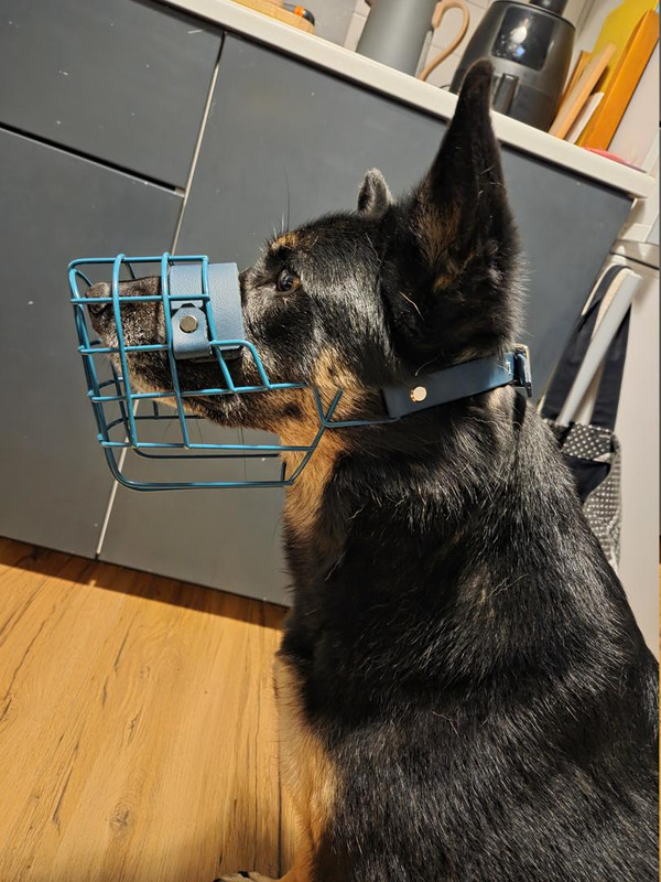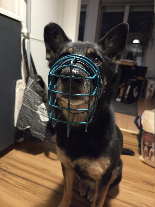 Schnüffeln ging mit der Zeit langsam, wenn auch deutlich weniger als ohne Korb. Zoomie war auch drin, ebenso wie wälzen. Nur beim Schütteln verliert sie den Korb sofort.