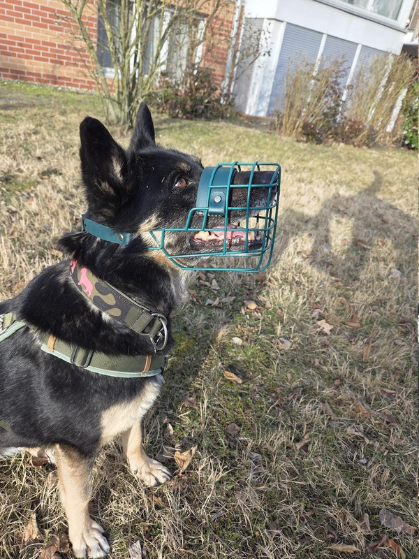 Wir schreiben Tag 2 mit Maulkorb-Spaziergang (gestern gab es nur Natur-Spaziergänge, da trägt sie ihn nicht).