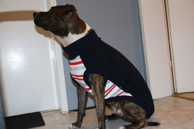 Die Maße der Bulli-Linie von sofadogwear passen hinten und vorne nicht mit denen von meiner Staff(Mix)-Hündin zusammen.
