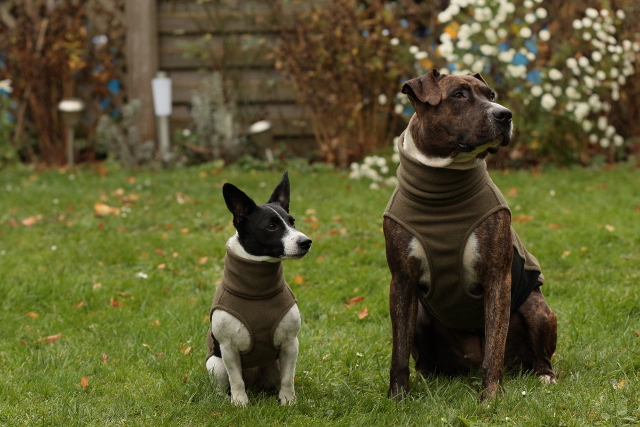 Ich hätte für meine Hündin zum warten mit ihrem Rücken gerade noch eine Art Unterziehpulli, wie sie es bei SofaDogwear und Doggear gibt.