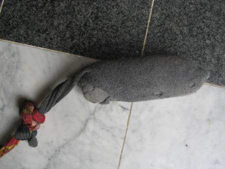 Das ist unser Sockenknubbel, der seit fast 8 Jahren von 1 - 6 Hunden malträtiert wird.