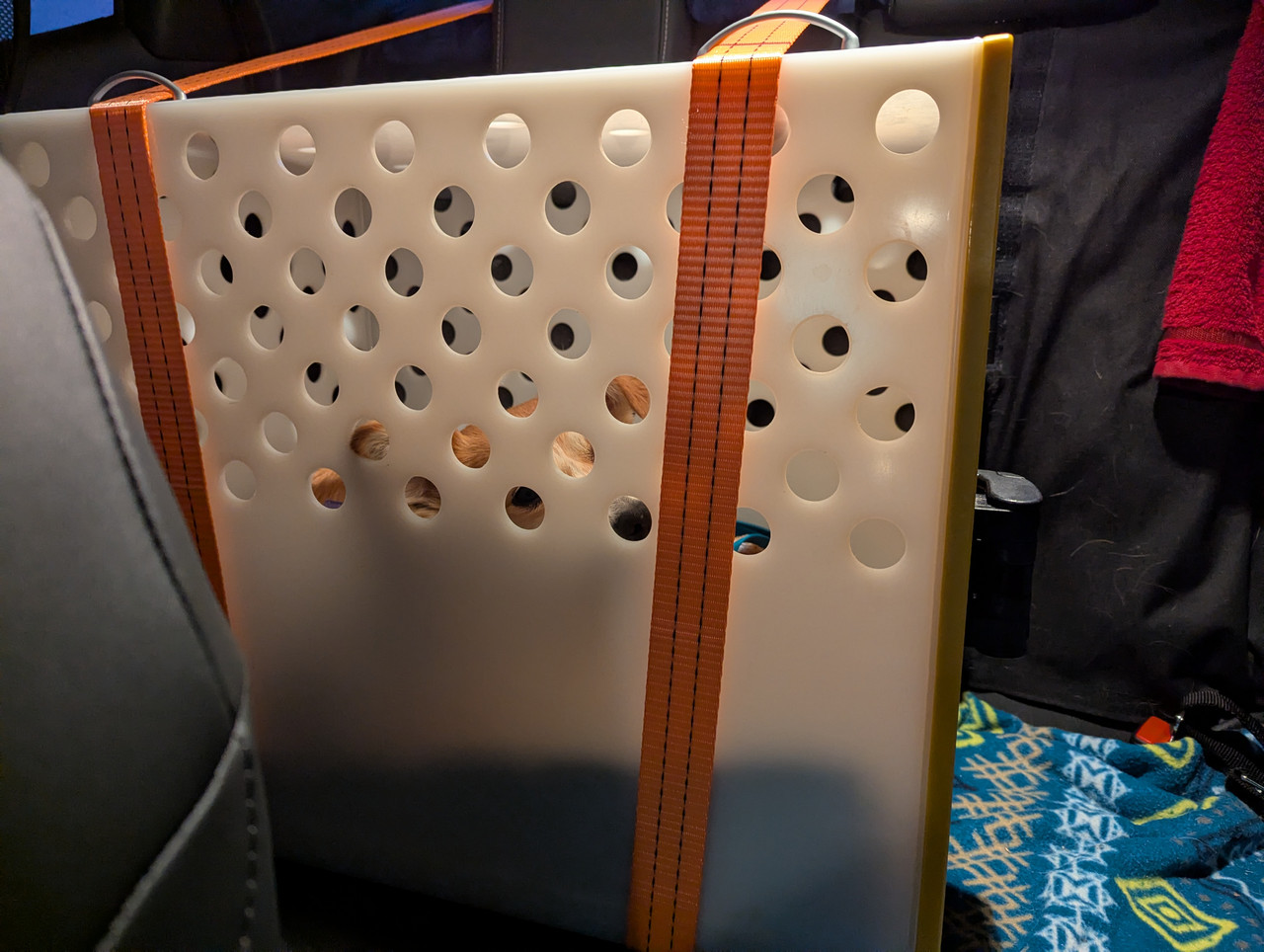 Hat Maß angefertigte Maße und zu mir hieß es damals das es eine spezielle Plastik Art ist, die bei einem Unfall/Zusammenstoß wohl nicht reißt/splittert sondern sich verbiegt. Genau die Schlaufen wurden auch auf Wunsch dran gemacht und die Box habe ich auf den Rücksitz drauf und mit 2 Spanngurten befestigt. ( Macht halt leider bissle Abdrücke in den Autositz rein).